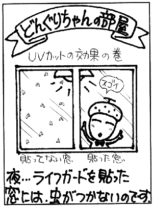 | 室内の蛍光灯などから出る、300〜400ナノミーターの波長の紫外線に虫は特に集まります。その波長の紫外線を虫から見えないようにすれば、虫はガラスや建物に等に集まってきません。 ライフガードを窓ガラスに貼ることによって、虫の好きな紫外線をカットし、虫の飛来を70%程度阻止し、昆虫を誘い寄せる光(紫外線領域)だけをカットします。 環境や人体にやさしい、薬品を使用しない防虫対策ですから、住宅はもちろん、食品を扱う業種や夜間営業される方々にぜひご検討をおすすめ致しします。虫と人間では目で感知できる光の波長域が異なり、多くの虫は紫外線波長をみています。紫外線を遮断することにより虫を寄り付かなくさせます。ただし、動物の二酸化炭素に反応してよってくる蚊の仲間には効果がないことがあります。 |